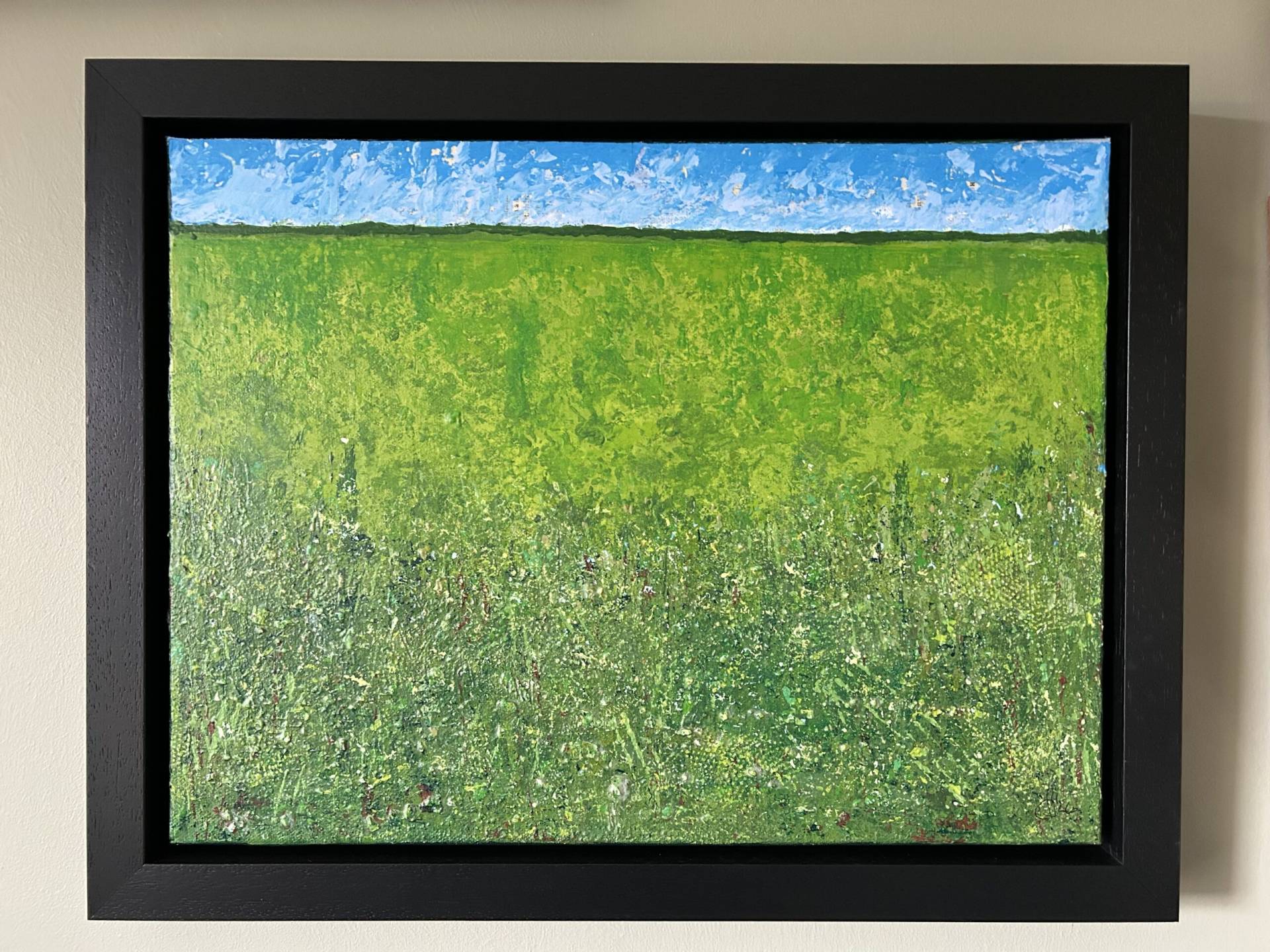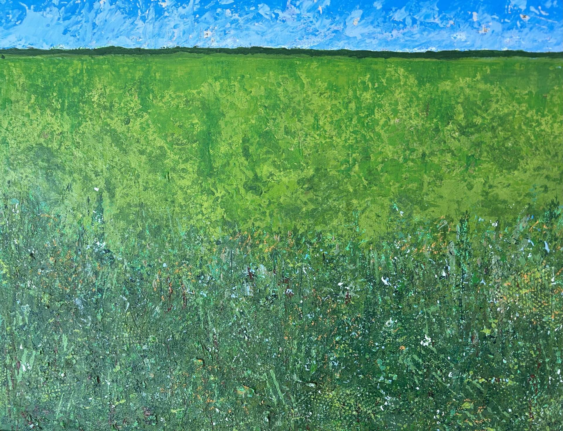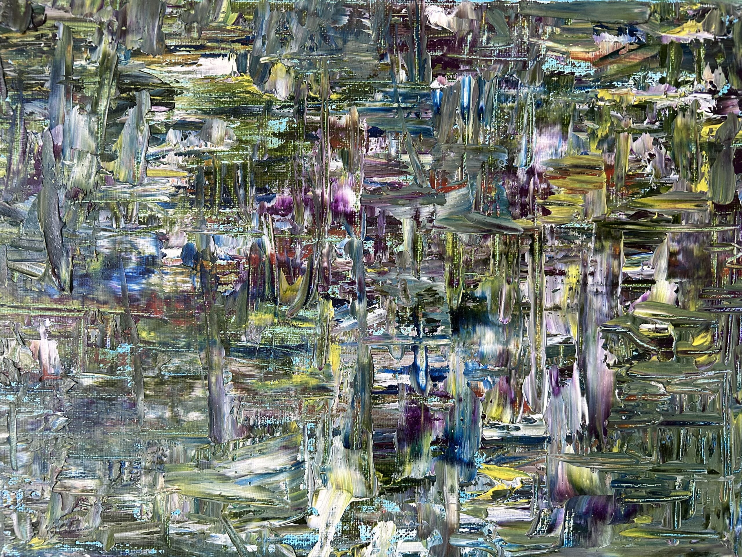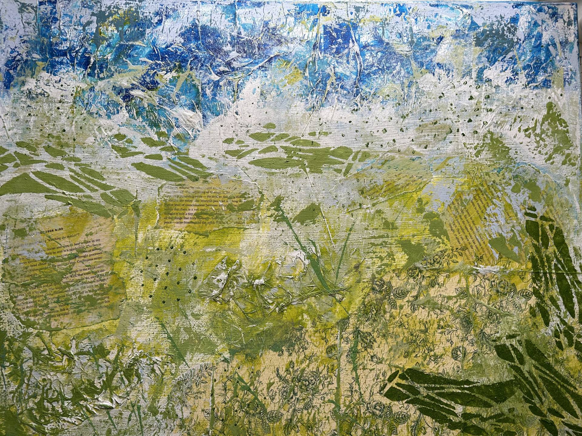 I spend much of my life outdoors, both through my garden design work and in my free time, and nature is at the heart of my painting. Designing planting schemes feels very similar to creating a painting: building layers, textures and movement to create depth, balance and interest. Walks in nature with my dog, Esme, whether along the coast, through woodland or across open fields, are a constant source of inspiration. I am endlessly drawn to the changing seasons and the shifting colours and textures of the landscape throughout the year. Working mainly with acrylic paint, I enjoy experimenting with mark-making tools such as brushes, sponges, spatulas and even my hands, often incorporating mixed media and found materials like tin foil, old credit cards or everyday objects to create unique textures and layers. Through my work I hope to capture a sense of the calm, restorative power of the natural world. I invite viewers to pause, look closely and perhaps discover their own meaning within the painting, and above all to experience a moment of quiet pleasure and peace.