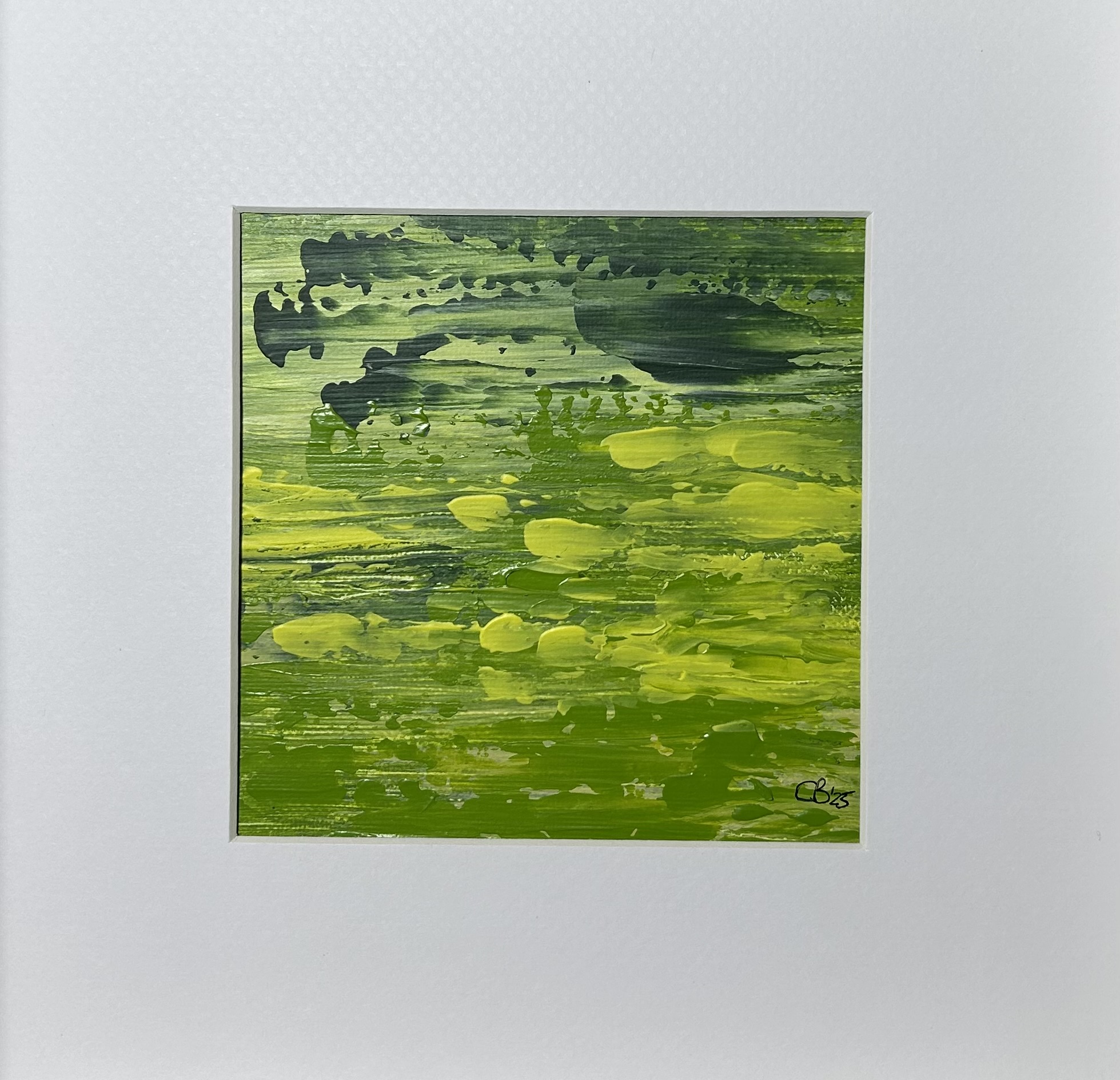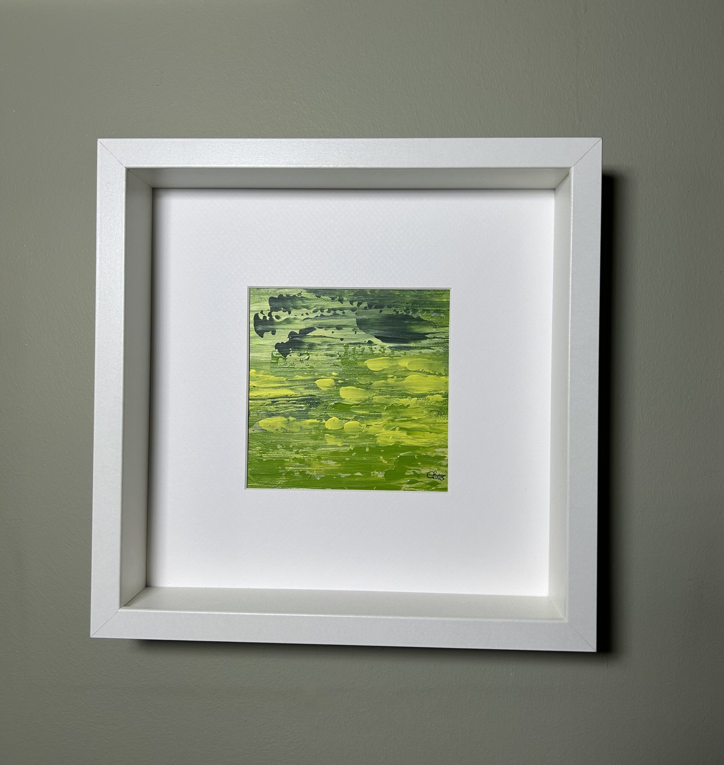 A Walk amongst the daffodils is an original abstract acrylic painting on stretched canvas board measuring 150mm by 150mm. The white wooden frame is 250mm by 250mm, aperture 120mm by 120mm and depth is 100mm.