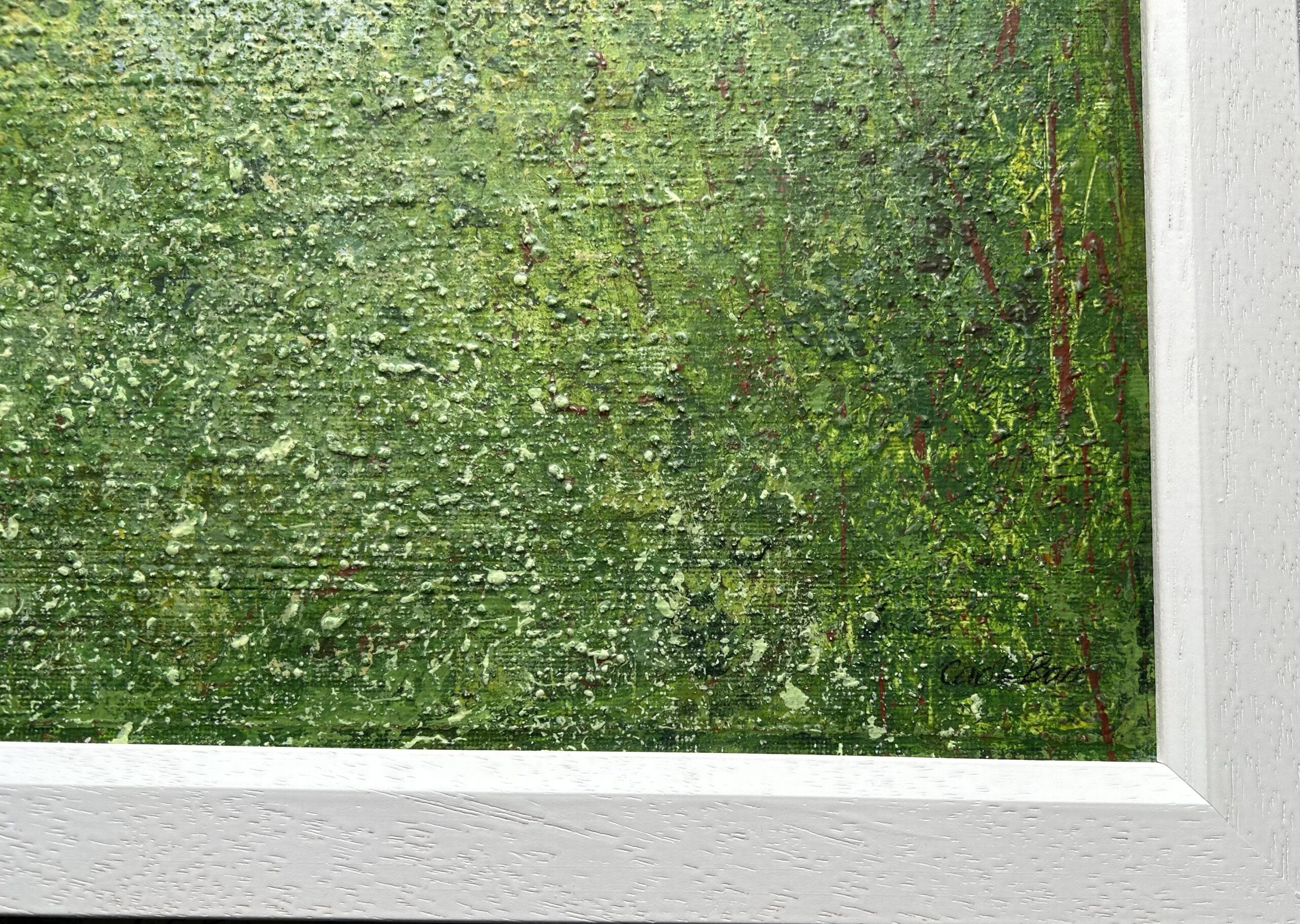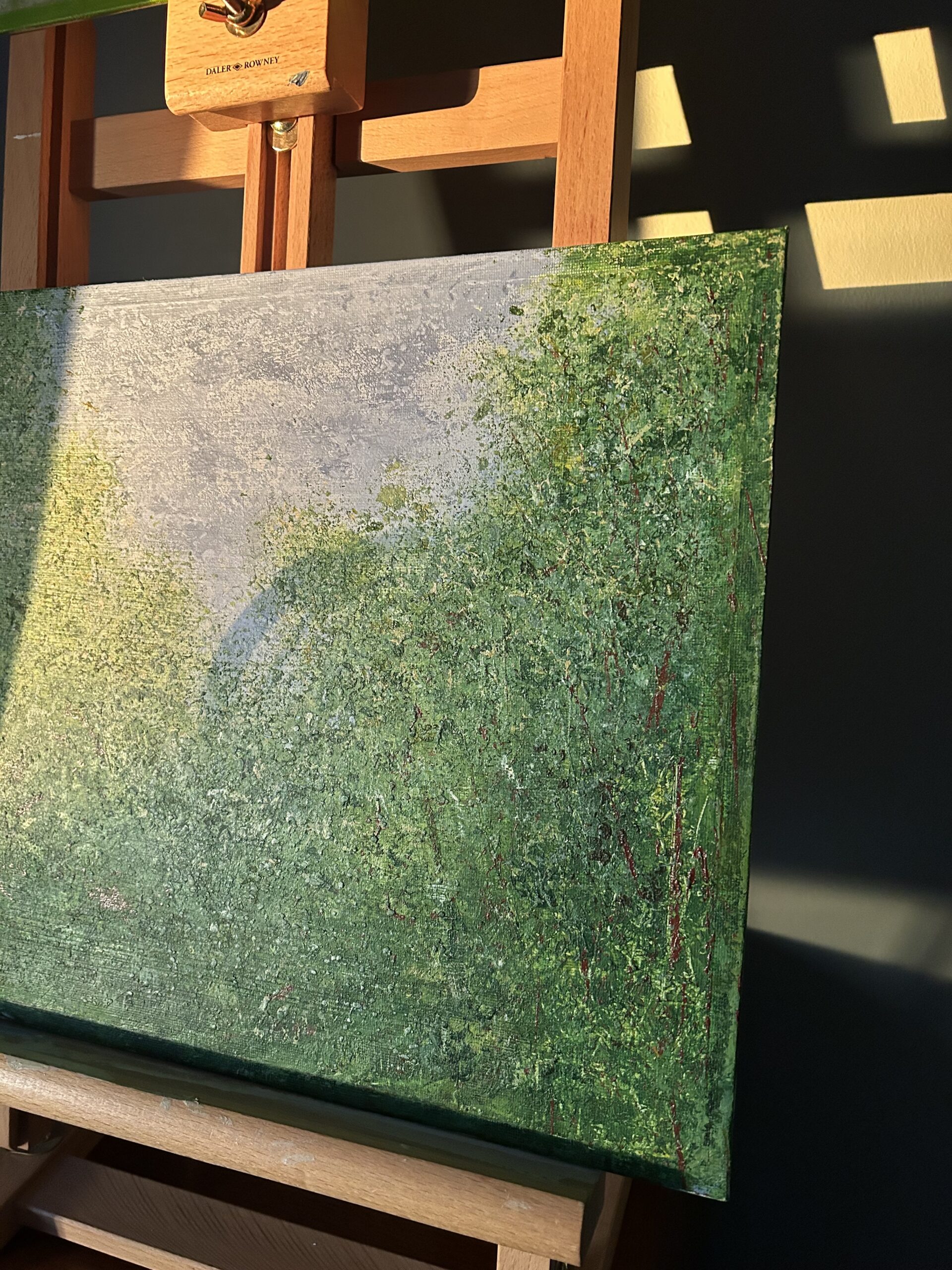 Nature’s Embrace captures that moment in summer – you are walking beneath and through the trees. The canopy gently enveloping you, you can hear the leaves rustling in the gentle warm summer wind. The ground underfoot is soft and yielding, the woodland floor shows dappled light from the sunshine on the horizon.